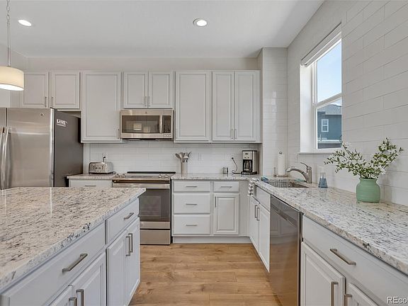 Beautifully remodeled unit facing green belt/parkway! Stunning south facing unit in one of the bestir locations in Littleton Village! This is the larger 2 bedroom unit built by Century Communites and features the builder upgraded kitchen with oversized island, extra cabinet space and huge pantry! This model also has the covered second story deck. This unit has been completely remodeled with new tile, new countertops throughout, laminate flooring and upgraded carpet, all new interior paint, custom window coverings/treatments, new appliances, updated hot water heater, and Nest thermostat. Just one block to the community park/dog park and a short walk to Starbucks! Large 2 car garage with extra room with storage. You will be hard pressed to find a nicer unit or location in Littleton Village.