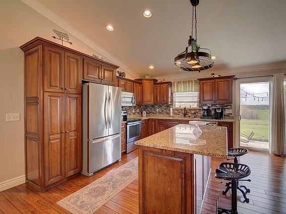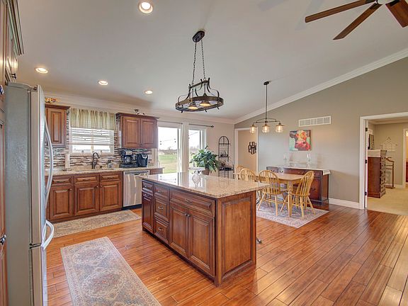 Welcome to this move in ready, brick ranch home with 2 detached garages/workshops on 1.92 acres*3 bedrooms, 3.5 bathrooms*STUNNING open floorplan, with updated kitchen featuring custom cabinets, granite countertops, stainless steel appliances, and hardwood flooring*Cathedral ceiling in living room provides ample natural light*Split bedroom floorplan with spacious primary bedroom&bathroom ensuite*Spacious and open finished basement with walk out offers plenty of flex space*New water heater*Detached garages are 20 x 30 and 30 x 40 & have concrete floors*Bigger garage features electric & two 10' overhead doors*Fenced yard*LEVEL lot & beautiful views*Quick possession can be offered to buyer*Don't miss out on this special property!