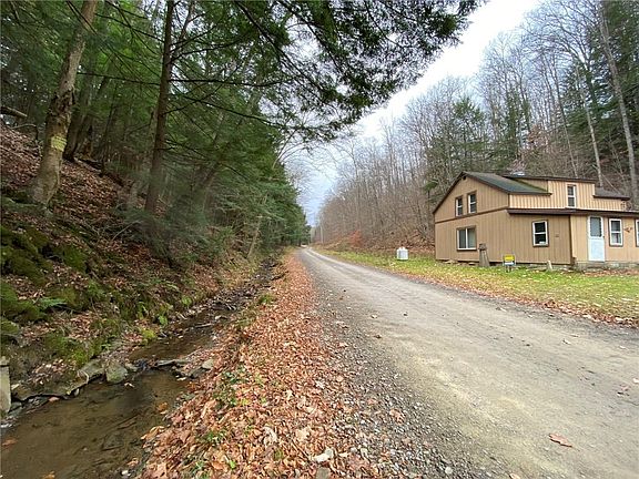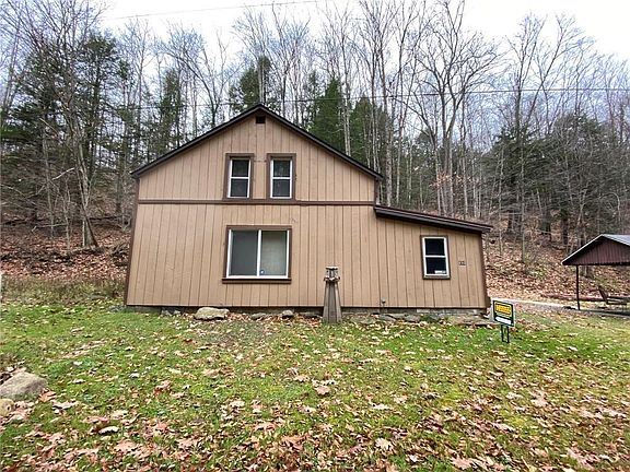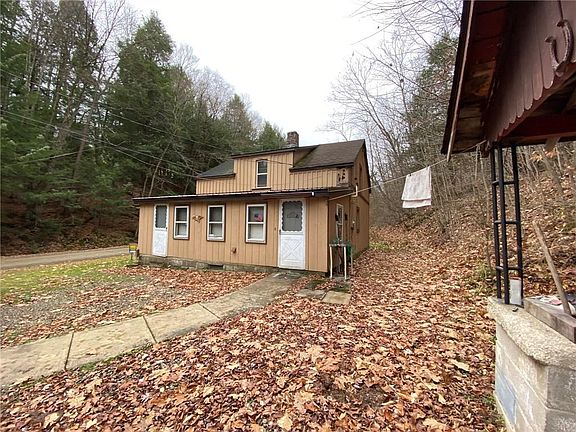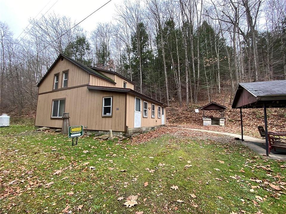 Deer, turkeys & bears, oh my! great trout fishing in Little Brokenstraw streams & others. Furniture included. Heated by brick woodburning fplc, new propane wall heater and pellet stove. Two 80 pound propane tanks filled 1x/yr. 2nd floor sleeps up to 9 people. Inground septic located on left side of home. Outdoor pavilion w/ brick chimney & vintage metal fire pit. detached garage/shed has elec. Improvements done in 2017:tin roof on front porch, 9 new windows, new floors in K & FR.