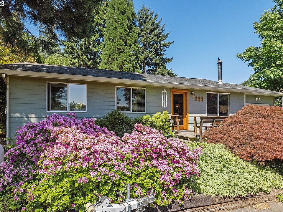 OPEN HOUSE 10-Noo Sunday June 4th. Tucked on a PRIVATE .16 R2 acre oversized parcel, this charming, ranch style home might be just perfect! Beautifully maintained, this 1040sqft home lives big! With newer laminate floors in the great room & a cozy wood burning stove, as well as central heat/air, it is comfy year round. Exit through the dining room slider onto a newly restored deck with a wisteria arbor & koi pond; it feels like your own park! It is private, quiet and beautiful, back yard is fully fenced with raised beds, lovely rock work, a fire pit, a generous storage shed, mature plantings and trees, and YES it has a treehouse!; it is gorgeous! A sweet kitchen with appliances included. 3 bedrooms with 2 baths including a primary bedroom and private bath & a slider to deck. Enjoy the sound of the waterfall as you drift off to sleep. Peeks of Mt. Hood, full garage & walk to town, schools and parks. A Hidden Gem! OPN HOUSE: 12:30-2pm Saturday, June 3rd