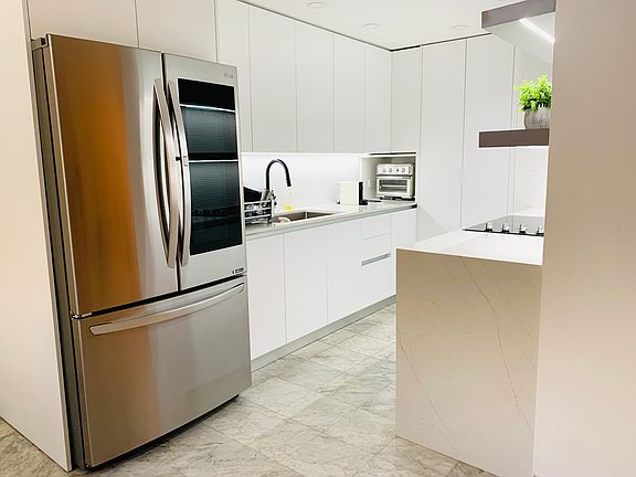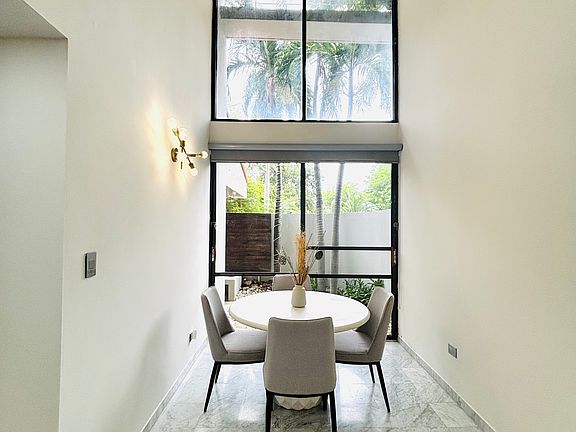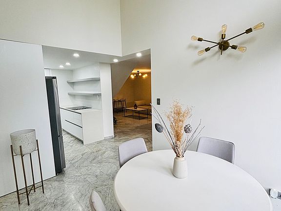 Experience modern living in this beautifully designed furnished two-level garden apartment. First Level: Step inside to discover an inviting living room and a cozy family room, perfect for relaxation and gatherings. The spacious dining room features soaring ceilings and large windows that flood the space with natural light. The completely remodeled kitchen boasts sleek finishes and ample storage. Step outside to the terrace, an ideal spot for barbecues and outdoor entertaining. This level also includes a convenient half bathroom for guests. Second Level: Ascend to the second level, where you'll find a master bedroom complete with an en-suite bathroom. A versatile second room awaits, perfect as a bedroom or home office. This floor also includes a laundry area and an additional full bathroom for added convenience. One covered parking is included on the same level as the apartment. With 24/7 security and a prime location close to supermarkets, malls, restaurants, and major highways, this apartment offers a perfect blend of comfort and accessibility. Don't miss the chance to make this your new home! Water service is included on monthly rent. Renter pays for electricity and internet services.