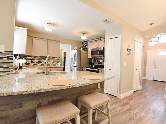 BEAUTIFULLY REMODELED HOME, OVER 1,700 SQUARE FEET UNDER AIR! A/C NEW, 2023! ALL NEW PLUMBING IN 2022! Step into this beautifully updated concrete block home and upon entry, the formal living and dining spaces welcome you, leading to a well-designed split floor plan that places the master bedroom suite on one side and guest bedrooms on the other. The renovated kitchen boasts solid wood cabinets, an extended bar, granite countertops, stainless steel appliances, and abundant storage. The home also features a bonus family room adjacent to the breakfast nook, perfect for entertaining. The spacious master bedroom suite includes a designer bathroom with a double sink floating vanity, a freestanding garden tub, and a large walk-in shower. Outside, a fully fenced backyard with a patio awaits your leisure. Nestled in the vibrant heart of Palm Bay, mere minutes from an array of shopping, dining, and top-tier entertainment options. THIS HOME IS A TRUE MUST-SEE AND YOU WILL LOVE IT!