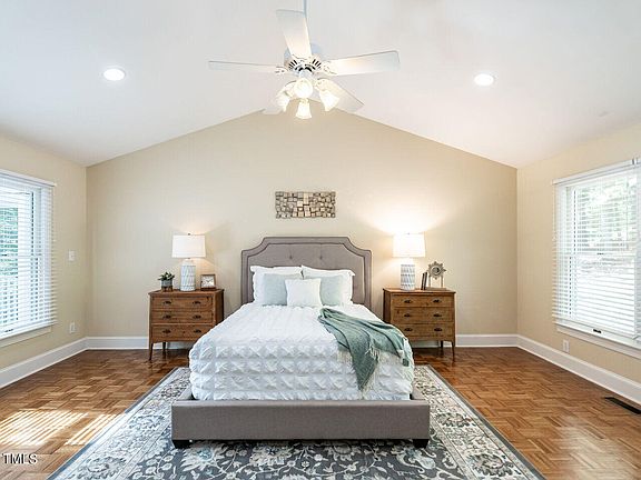 Discover this charming 3-bedroom, 2-bath ranch home, perfectly situated on over 1.1 acres of land in the highly sought-after Fearrington community! Move-in ready and brimming with character, this home offers privacy and tranquility while still being close to everything. Featuring stunning Parkay floors and spacious bedrooms, there's plenty of room to unwind and enjoy the peaceful surroundings. Vaulted ceilings with skylights flood the living spaces with natural light, and a cozy fireplace with custom built-ins adds warmth and functionality. Relax in the bright sunroom or on the serene screened-in deck, where you can soak in the beauty of your expansive property. Perfect for hosting, the formal dining room sets the stage for memorable gatherings. The oversized laundry room is a dream, with abundant storage and a dedicated counter for folding. The primary suite is a private retreat, complete with a walk-in closet. With its modern amenities, secluded setting, and the charm of Fearrington Village, this home offers the perfect blend of space, style, and serenity!