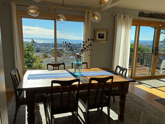 This airy and bright home has expansive views of San Francisco, SF Bay, Golden Gate Bridge, Bay Bridge, and Mount Tamalpais. Open plan kitchen, living room, dining room, and deck with sofas and big sliding glass doors - all facing south with lots of sun and head on views of the Bay, SF, bridges, and Marin. 2 story home with 4 bedrooms, 2 full baths, and an additional living room with kitchenette that also has both an internal and an external entrance and can be used as a guest/in-law suite. Recently renovated backyard includes brick patio with outdoor sofas, cafe lights, fire table, play area, planter boxes for veggies, and drip irrigation throughout. Brick courtyard outside of the kitchen also serves as additional outdoor dining and lounging or play area. High quality furniture throughout. Home features also include fully updated kitchen with all new, energy efficient appliances, updated kitchen cabinetry, large closets throughout, brand new air conditioning system, two independent heat and air conditioning zones (up/down) with Nest programmable thermostats on both levels, driveway parking for 1 car, 2-car garage, washer/dryer, new double-pane windows, Ring front entrance camera, security system, and high speed wifi with Google Mesh routers. Located in the beautiful hills of El Cerrito, the home is a 10-15 minute walk to BART (El Cerrito Del Norte station) and many parks and open spaces Canyon Trail Park (tennis courts, playground, field, and wooded walking paths), Tassajara Park (great playground and picnic tables), and Hillside Nature Area (access to miles of single-track hiking trails). Centrally located in the East Bay - 10-15 minute drive to Solano Ave and downtown Berkeley, 20-30 minute drive to fantastic Marin destinations and beaches, and 30 minutes to San Francisco via BART or car. 1 year rental. Option for fully furnished or partially furnished. $8,000 per month includes garbage/recycling/compost. Electricity, water, gas, cable and internet separate. Smaller and well behaved pets will be considered. Option for fully furnished or partially furnished. Rent includes garbage/recycling/compost and monthly yard maintenance. Electricity, water, gas, cable and internet will be due separately. Smaller and well behaved pets will be considered. Absolutely no smoking. June lease start ideal - open to to a July or August start for the right fit.