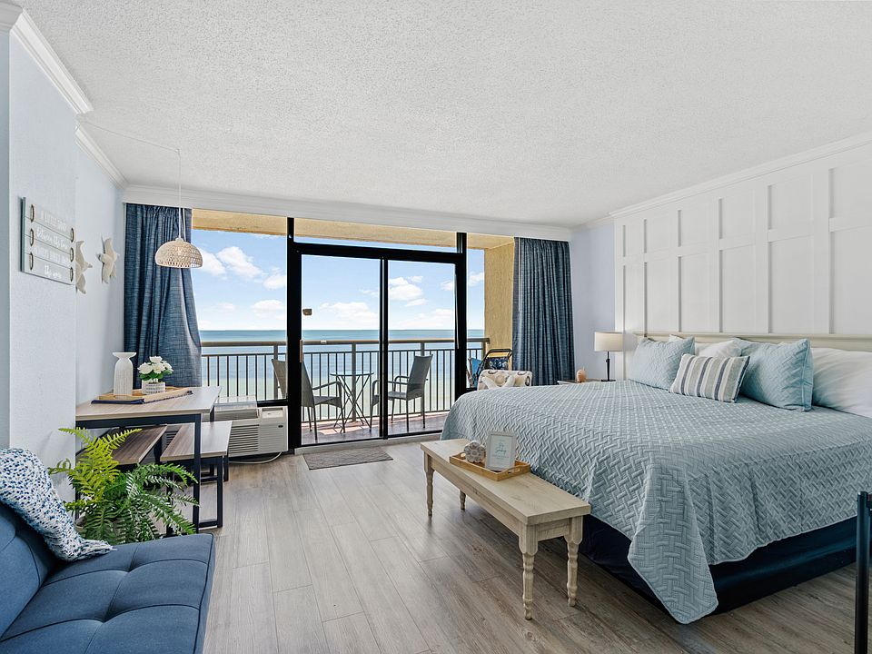 Monthly rental available in our direct ocean front studio located in the Golden Mile area of Myrtle Beach. This quiet, residential neighborhood offers a more relaxed atmosphere, while still being close to great dining options many within walking distance. This 11th floor condo is fully furnished and features a fully equipped kitchen with a full-sized refrigerator and stove, king bed and futon. Bedding, linens and bath towels are included at the beginning of lease.