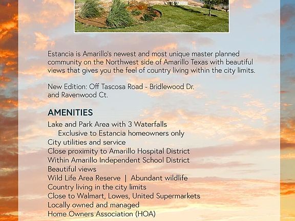 ***Block 4 Lot 21. 6900 Windy Ridge***This lot is at the end of a CUL-DE-SAC that backs up to rolling terrain and offers family friendly living! Residents can expect walking trails, wildlife, constant-level stocked lake, three fountains and a park! Estancia is Amarillo's newest and most unique master planned community on the Northwest side of Amarillo TX with beautiful views that gives you the feel of country living within the city limits.