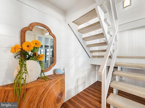 Solace on the Sands. Welcome to 6901 Atlantic Ave., an exceptional oceanfront retreat that seamlessly blends modern coastal charm with timeless elegance. Once a classic Ocean City, brown-paneled wall beach residence, this home has been completely reimagined and transformed into a showpiece worthy of the finest coastal magazines. From the moment you step inside, you’ll be captivated by the open-concept design, awash in natural light. The spacious interiors, defined by their bright, white palette, create a serene atmosphere, enhanced by soaring open-beam ceilings and sleek paneled walls that amplify the sense of space. This residence is a true haven for coastal living and entertaining. The main living area invites you to unwind, with sliding glass doors that lead to a covered patio—offering direct access to the expansive sands of the Atlantic. The gourmet kitchen is a true standout, featuring striking blue cabinetry and quartz countertops that evoke the fluid movement of waves meeting the shore. Serve your culinary creations at the breakfast bar or in the sunlit dining area, where more sliding doors open to the rear patio and sundeck—perfect for alfresco meals or evening cocktails. On the sleeping level, the primary suite offers a private sanctuary, complete with its own balcony overlooking the beach. Here, you can savor stunning sunrises and the soothing sounds of the waves crashing ashore. The guest bedroom also provides a comfortable retreat, complemented by a well-appointed hall bath for added convenience. This thoughtfully designed home includes additional features such as a laundry center, a secure storage area, and covered parking beneath the home—safeguarding your vehicle from the sea’s elements. The rear sundeck offers easy access to a dedicated entrance, allowing beachgoers to store their gear without tracking sand throughout the house.