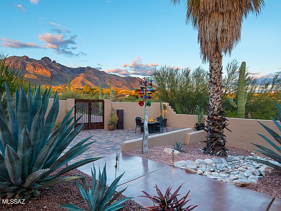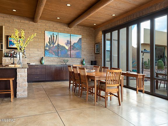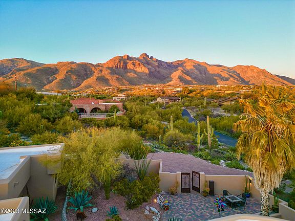 This quintessential David Tyson designed contemporary style retreat invites you to experience unrivaled views and serenity. This home embodies an ideal combination of bold and unique style, clean modern lines, exposed wood ceilings and low-maintenance concrete floors. The floor to ceiling windows bring the natural beauty of the outside in, with spectacular mountain and city views, while thoughtfully placed overhangs protect from direct sunlight. The open-concept floorplan features three distinct bedroom wings, offering ultimate privacy for family members or guests. Both main house HVAC units have been replaced in May 2023. The primary suite features a sitting area and fireplace with spa-like ensuite, dual walk-in closets with custom California Closets systems, and a private patio with hot tub for sunset Catalina Mountains views. At the core of the home is an expansive living space, ideal for entertaining, featuring two distinct dining areas, and a luxurious chef's kitchen, complete with top-of-the-line appliances and a butler's pantry. The stunning recycled glass countertops that are non-porous, resistant to stains bacteria and heat and are easy to clean. Intentionally tucked away in the butler's pantry is a steam oven, warming drawer, coffee station and ample cabinetry and additional countertop space. Utilize the separate wet bar with wine fridge and ice maker to host gatherings, large or intimate. with a A 15-ft foldaway glass wall blurs the boundaries of indoor-outdoor living, connecting you with nature, the vast mountain scape and beautifully landscaped, completely walled-in private courtyard. Immerse yourself in the surrounding nature and unwind on the elevated covered south patio, next to the koi pond water feature overlooking the pool and spa, which draw your gaze toward the twinkling city lights. In addition to expansive main house, this premium lot offers a 797 sqft guest house w/ private entry, kitchenette, living room, bedroom and ensuite bathroom, complete with washer/dryer hookups. Just moments away from La Encantada shops and restaurants, Banner Medical and The U of A, foothills hiking trails, top-rated Catalina Foothills schools, and much more. Schedule a private appointment to view this one-of-a-kind masterpiece.