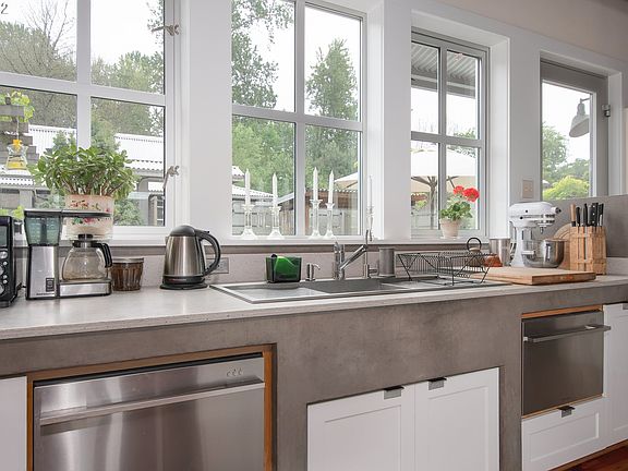 First time on market. Full cement float on both house & tender. Architect designed, constructed by Marc Even. Silhouette crafted after warehouses along Seattle waterfront. Industrial vibe throat, including recycled wood floors, commercial aluminum windows &doors, concrete treatments in kitchen, floor & fireplace, open staircase, massive glue lam beamed ceiling w/corrugated metal ceiling treatment. Hot water on recirculation loop. Custom courtyard 'room'. IPE decking. Includes tender (ADU).