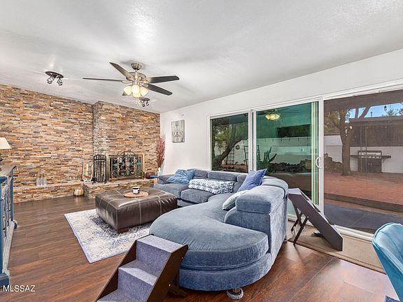 Charming 4-bedroom & den property nestled on a quiet cul-de-sac in Tucson is now on the market! Circular driveway & beautiful shade trees will greet you upon arrival. Explore inside to discover an inviting living area featuring wood-look floor, soothing palette, an impressive stone fireplace, & multi-sliders leading to the back patio. The impeccable kitchen offers white shaker cabinets with crown moulding, granite counters, stainless steel appliances, stylish tile backsplash, track lighting, & an island with a breakfast bar. Continue into the primary bedroom showcasing a private bathroom with granite dual sinks & a walk-in closet. The spacious backyard with a full-length covered patio, a decorative fountain, & plenty of space for entertaining is waiting for you! Don't miss out on this one!
