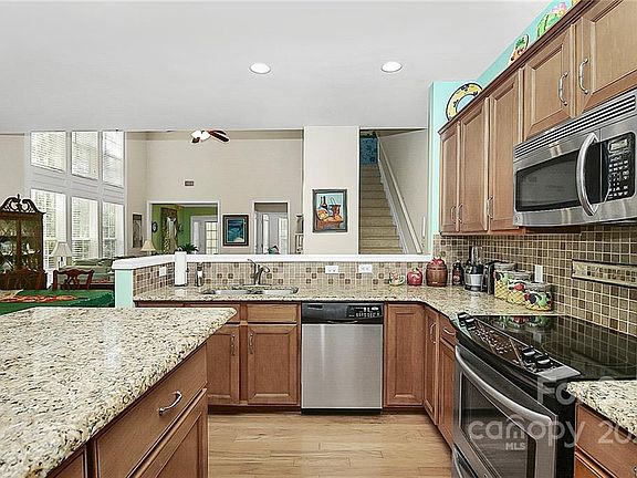 Highly desirable Matthews Ridge home! Beautiful, upgraded home features stunning 2 story Great Room with fireplace and an abundance of windows! The updated kitchen has stainless steel appliances, granite countertops, tile backsplash, oversized custom kitchen island with seating for entertaining. Spacious dining room area for holiday meals. The generously sized master suite has tray ceiling, new carpet (7/18/22), large walk in closet and master bath. Second bedroom on main level with private full bath. Upstairs has loft space for desk/office area, and a large bedroom with private full bath. Easily accessible walk in attic space for plenty of storage. This home sits on a large corner lot with fully fenced backyard and screened in porch! Walking distance to shopping and dining at McKee farms. New HVAC in late 2019, HOA takes care of lawn service outside of fence for low maintenance living! This home is a gem, immaculately maintained and move in ready!
