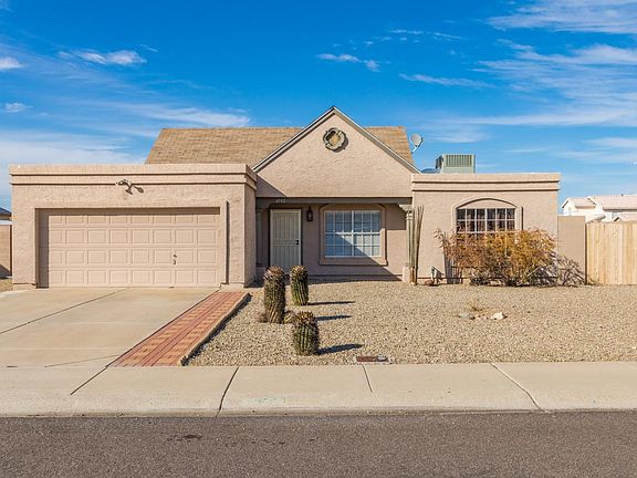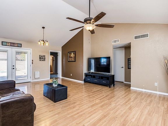 Fantastic single level Home with dramatic soaring ceilings, warm & welcoming palette, beautiful laminate wood floors, French doors to patio, ceiling fans, & window blinds. Plenty of wood cabinets in kitchen w/large pantry. Grand master retreat boasts double door entry, plush carpet, patio access, and private en suite. Generous size bedrooms, upscale baths, ample closets, & interior laundry room. Enjoy the backyard covered patio & sparkling pool. RV gate. No HOA! Will not last!