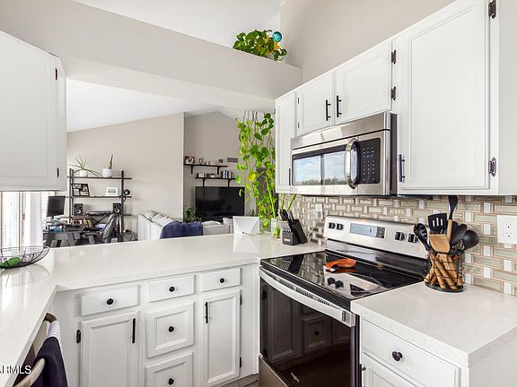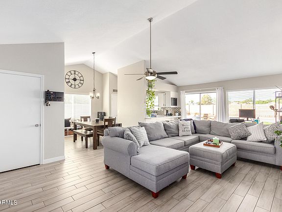 Look no more! Nestled on a spacious corner lot, this charming single-level home offers an inviting blend of comfort & style. Providing 2 beds, 2 baths, & a 2-car garage. Enter to find a perfectly flowing living & dining room adorned with vaulted ceilings that add a touch of grace to the space. Abundant natural light, wood-look tile flooring in common areas, and carpet in bedrooms are some attributes worth mentioning. The kitchen boasts SS appliances, quartz counters, designer backsplash, a pantry, white cabinetry, and a breakfast bar. Main bedroom has access to the back and a private bathroom w/tiled step-in shower. Let's not forget the large backyard! Its artificial turf, firepit, & well-laid pavers create a perfect spot for relaxation and gatherings. The RV gate is a PLUS! Welcome home!