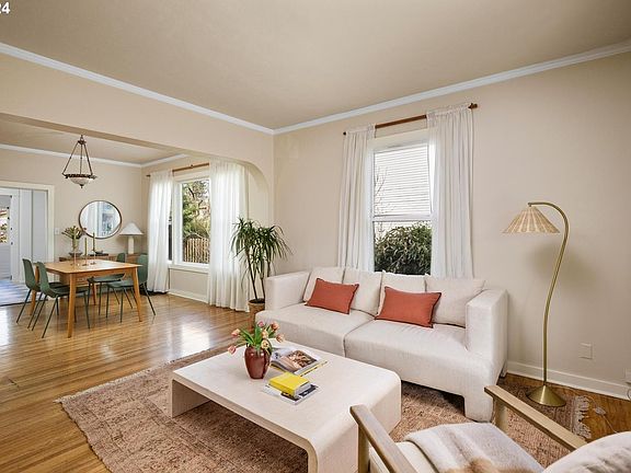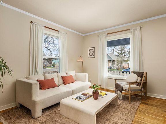 Welcome to this sunlit marvel, where the warmth of natural light greets you at every turn in this 1908 Bungalow. Step onto the covered porch and envision lazy afternoons spent soaking up the sun's rays. This Fo-Po sweetheart boasts 9' ceilings, built-ins, original hardwood floors, a large dining area, laundry on the main level, and so many windows. Enjoy the large kitchen adorned with fresh quartz countertops, marmoleum checkered flooring, new fridge and dishwasher, and a pantry! Fresh interior paint throughout the main floor. The basement is bright and clean and offers amazing usable flex space and storage. Behind french doors you'll find ample space for an office, gym, or a media room - with potential to add a second bathroom and finish the space. Outback, the fully fenced yard with apple, peach, and fig trees, lavender, lilac, roses, and honeysuckle, creating a sweet retreat. Walking distance of the vibrant neighborhood of Fo-Po, this home puts the best of Portland within reach. Blocks to Arleta Elementary, Pizzeria Otto, Carnelian Coffee, Bar Carlo and so much more. Minutes to Trader Joe's and New Seasons. Enjoy this vintage home with all the modern upgrades. AC '22, Sewer '16, Decommissioned oil tank, double paned windows. Walk Score: 92 | Bike Score 99 | Energy Score 7