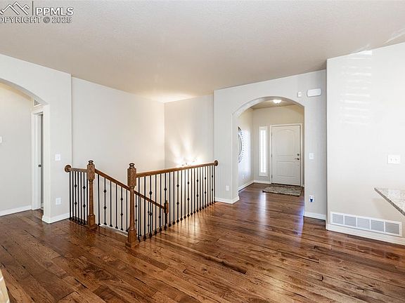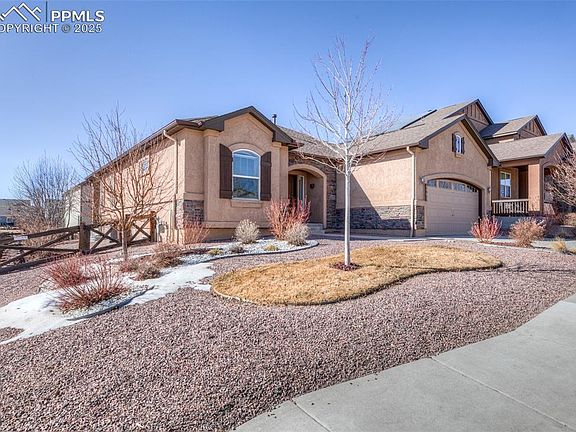 Discover the charm and elegance of this 5 bed, 4 bath home nestled in scenic neighborhood. Move-in Ready Ranch with a Primary Suite on main and Jr Suite in Basement in the sought after Eagle Point in Banning Lewis. With it's open floor plan, high ceilings, and abundant natural light, this home offers spacious living at its finest. As you step inside, the expansive kitchen catches your eye, equipped with custom cabinetry, grantite, stainless steel appliances, and a gas range, perfect for creating memorable moments. The kitchen island and pantry provide ample storage, while the adjacent dining and living areas flow effortlessly for easy entertaining. Gather around the fireplace for a cozy evening in. Primary retreat is a true sanctuary, 5 piece ensuite bath and walk-in closet, offereing convenience and luxury. Rounding out the top floor is an office/bedroom with a full bath next to it, laundry room equipped with front loader washer and dryer & utility sink. Venture downstairs to the large family room with 11' movie screen and projector with tech equipment in the adjacent closet. It also features a wet bar area to really make a hit on movie night. Tucked behind is a full size bath, and a Jr. Suite with walk-in closet and ensuite bathroom with luxury shower. On the other side of the family room is 2 more spacious bedrooms, each with large walk-in closets. The custom drapes in each room really make this house feel like a home. The exterior is fully landscaped with a split rail fence around the sides and back leading to the expansive back patio which has a stub out for a firepit or BBQ grill. If you have a green thumb, then this is the home for you with raised garden beds already installed with protective fence and covering and a SMART sprinkler system. This home is in a great location close to 2 parks, 1 of which has the community pool, lots of walking trails, close to shopping, restaurants, military bases, and schools. Call this house your home today!