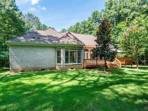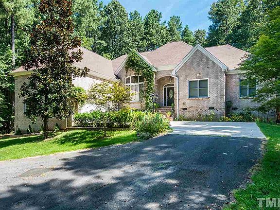 A private setting minutes from Brier Creek. Easy commute to Raleigh/Durham. A brick, custom, one-level living home tucked away on 2.62 acres. Open living room w/soaring ceiling. Hardwood flrs throughout the downstairs. A large Master w/ private Sunroom. The kitchen w/a Tile center island has a Viking 6-burner gas stove. Living area upstairs would lend to a wonderful separate living qtrs.