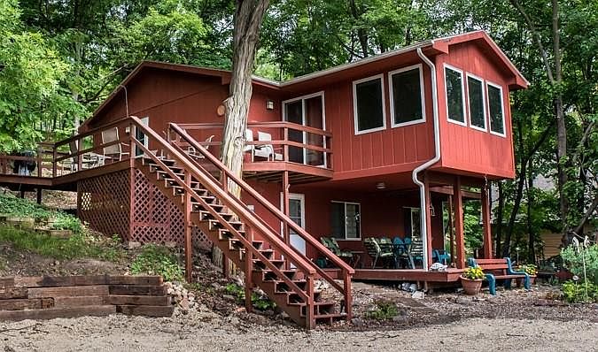 Nestled in the beautiful and tranquil cove by the dam, you'll be treated to amazing sunrises, abundant wildlife, and so much more. The main level features a beautiful sunroom with amazing views, two decks and spacious kitchen, living room and master bedroom. Gather friends and family around the firepit after a long day on the lake or move the party inside to the cozy lower level family room. Your 75 feet of water frontage includes the dock and lift. This property is being offered as mostly turn key, and has quick access to Highway 44.