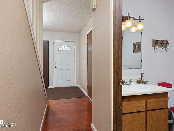 Great home with southern facing back yard exposure. This home features an over-sized master bedroom with private deck. 3 beds up and full bath. Downstairs living room has a fireplace, 1/2 bath and extra storage, heating system is only a couple years old. Great location for trails, commuting to JBER, college & hospitals. Clean and ready to move in! 2,000 flooring allowance and home warrnty!