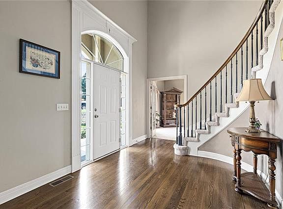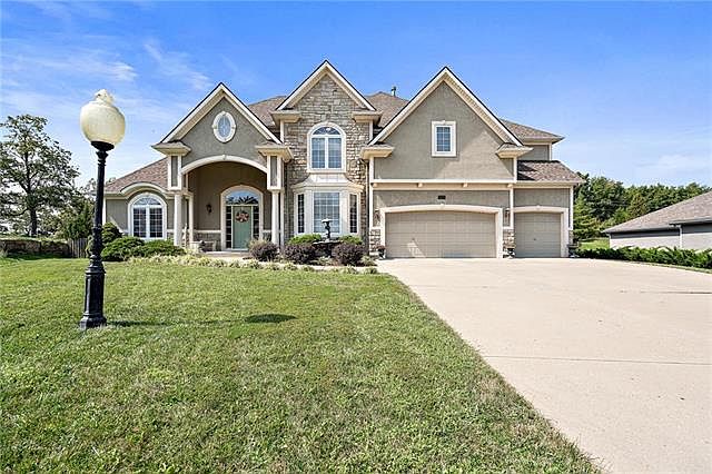 Breathtaking 2-story home in the highly coveted Charleston Harbor. Inviting entry w/ gleaming hardwood floors. Living room features a fireplace & wall of windows overlooking the KC Skyline. The gourmet kitchen boasts cust. cabinets, granite counters, a large island w/ cooktop, pantry & brkfst room w/ adjoining hearth room & formal dining. Master suite w/ a sitting room, fireplace, private deck access, dbl vanity, tile walk-in shower & huge closet. All secondary rms w/ bath access. Large fenced yard & covered patio!