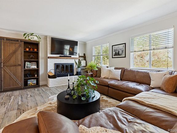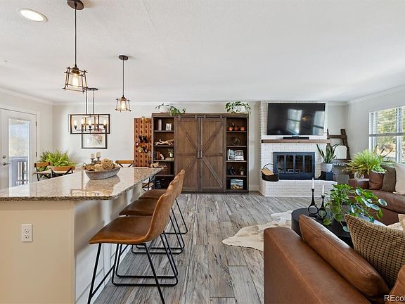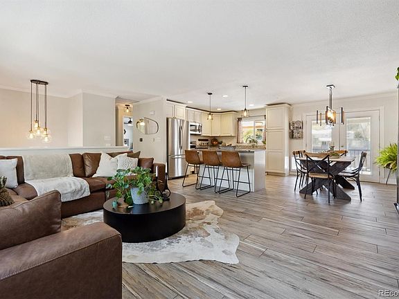 Welcome to this tastefully updated charming 4-bedroom, 2-bathroom bi-level home in the highly desirable Walnut Hills neighborhood of Centennial. Step inside to discover porcelain wood tile flooring that flows throughout the main level, where an open-concept design seamlessly connects the kitchen, living, and dining areas. A stunning floor-to-ceiling brick fireplace with a wood-burning feature anchors the living room, creating a cozy atmosphere for gatherings. The spacious kitchen boasts a granite island with breakfast bar seating, stainless steel appliances, and a built-in wine cooler, making it perfect for both everyday meals and entertaining. Adjacent to the kitchen, the dining room features French doors that open to the backyard, extending your entertaining space outdoors. The main level includes two bedrooms, each with extended closets and ample built-in storage, along with a beautifully updated bathroom. On the garden-level, you’ll find two additional bedrooms, another full bathroom, and a large flex space ideal for a family room, home office, or gym, with a convenient washer and dryer closet nearby. The quarter acre backyard is a true retreat, complete with an expansive Trex deck offering both covered and uncovered seating areas. Enjoy the large grassy yard, a concrete patio, and ample room for outdoor activities such as volleyball, a pool and more. Additional features include a one-car extended garage with double insulated garage and exterior door, plus extra storage. This home’s central location provides quick access to shopping centers, I-25, Park Meadows Mall, and nearby walking trails. It is also walking distance to Pindustry, Fiddlers Green Amphitheatre, and multiple breweries! This home offers the perfect balance of convenience and community. Don’t miss your chance to make this ‘your’ new home!
