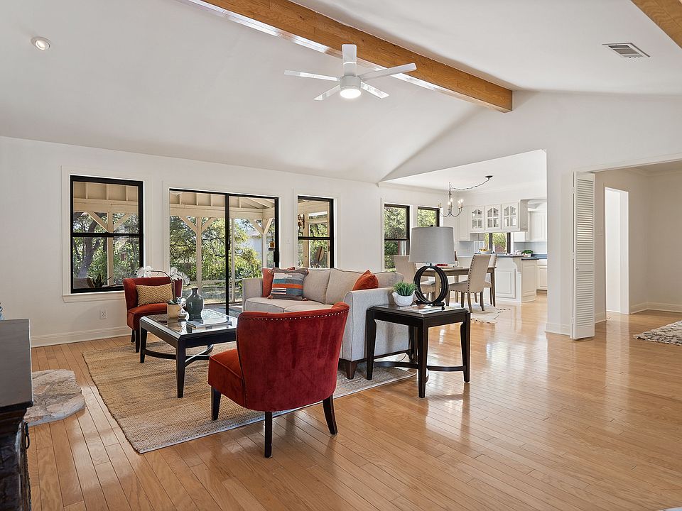 Mid-Century Modern on a huge lot with a screened-in porch and greenhouse! One of the best locations to live in Austin! Minutes to downtown, the airport, Hwy 290, Mopac, and best of all there is no HOA! Large oak trees abound in the over 1/2 acre lot that backs to a beautiful greenspace owned by the neighboring HOA. Grow your own food year-round in the fabulous greenhouse. Two large metal storage sheds provide plenty of storage. This home is very unique and has a separate guest wing with its own access that can be closed off to the rest of the house. It includes a bedroom and bathroom that could possibly be used as a short-term rental/long-term rental or you can STR the entire home. (The STR would have to be approved by the city of Austin.) Relax while lounging in the large screened-in porch and enjoy the tranquil peace and quiet of the enchanted forest-like huge backyard. The interior of the home has new paint and ceiling fans. It also features various types of wood and tile floors with the exception of carpet in the media room for sound absorption. The large media room was built with double stud insulated walls which provides soundproofing to the rest of the house. It comes complete with a built-in projector, huge screen, professional sound system, and media chairs. 4 full bedrooms, 3 full bathrooms (the secondary bath has lighting/ towel racks/mirror from Restoration Hardware, and the Primary Bath boasts a Pottery Barn sink unit with a marble top). The huge yard can accommodate kids, dogs, a pool, and plenty of room to grow! This home is unique and a must-see! The house is larger than the tax records say, it will be measured on 10/17 by Floorplan Graphics.