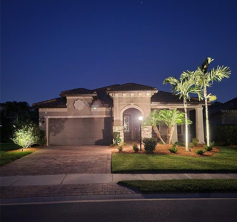 Price Improvement - The best value in Del Webb currently on the market with pool/spa/water-view offering 4 bedroom, 2 bath 2000 SqFt. Experience elegance in a resort like setting! ~Move in ready~ In HIGHLY SOUGHT AFTER GATED, 55+ Del Webb community. The moment you walk through the front door you will feel at home. Once in, you will see the oasis that awaits you, with stunning lake view, to the beautiful pool that sits just beyond the large lanai and screened pool cage, perfect for watching evening sunsets or entertaining. This stunning home features 4 Bedrooms, one with new Murphy bed wall unit & 2 Full Baths, tile throughout. House features 9' ceilings. An upgraded Chef's Kitchen boasts wood cabinetry with crown molding, stainless steel appliances including the newly installed KitchenAid dishwasher in 2023, includes a NATURAL GAS STOVE, Quartz COUNTERTOPS and generous pantry. The kitchen has a breakfast island, as well as formal dining area. A fully remodeled laundry room features 42" cabinets along with GE Profile matching washer and dryer installed in 2023. Generously sized Master Suite with walk-in closet for plenty of storage. MASTER BATH with dual sinks, and ample linen cabinet. Master has a generous walk-in closet. Split design with guest bedrooms on the opposite side of the home. Home features SONOS sound system and ALL LED LIGHTING installed in 2023! Lanai, and pool deck, perfect for entertaining and overlooks impressive pool/waterfalls and spa. Professional landscape lighting for added ambiance, in front and back. House sits on a secluded lake providing stunning views from home and lanai, enjoy your morning coffee while listening to wildlife. The remote activated, motorized lanai shade offers wind break, privacy or extra sunshade. Two car extended garage with abundant overhead storage and 220V power for EV charging, brick paver driveway with new landscaping, irrigation system with reclaimed water that is included with HOA dues. Ring doorbell and pool area security camera along with whole house surge protector all installed in 2023. GATED Del Webb community amenities include Clubhouse, Fitness Center, Pickleball, Walking Trails, Tennis, Disc Golf, Resort Style Heated Community Pool & Spa, Lakehouse Restaurant and LOW HOA fees. Country feel yet minutes to Siesta Key Beach, St Armands, shopping & dining, and UTC. One look & you'll fall in love with this immaculate home. Don't miss this opportunity!