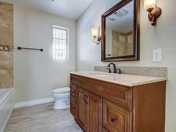 Gorgeous home remodeled to perfection! New 2 tone interior and exterior paint, new 12x24'' tile in beautiful neutral tone, new carpet in bedrooms, new oil rubbed bronze light fixtures, ceiling fans,plumbing fixtures and door hardware, recessed lighting in kitchen. Kitchen is remodeled with rich finishing touches incl. new granite slab counters with travertine backsplash, under mount sink, and new cabinets with plenty storage & pantry cabinet. Includes new stainless steel appliances feat. smooth top electric range, over range microwave & dishwasher. Both bathrooms are remodeled featuring new travertine surrounds in showers, beautiful vanities, mirrors & light fixtures.Not a short sale or REO,Agent/Owner.