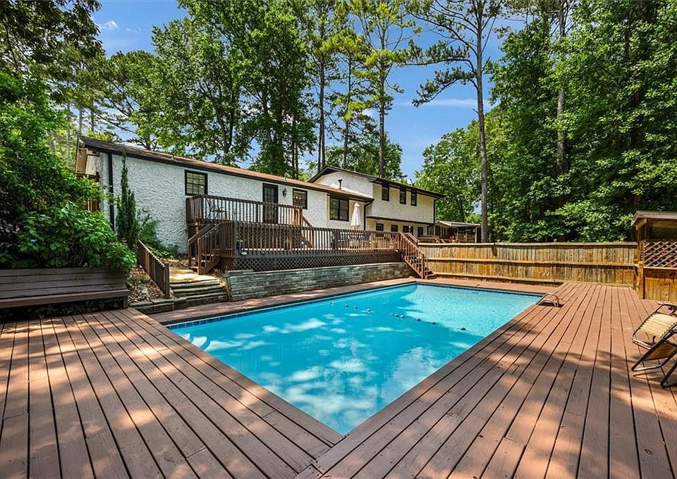 Summertime means the PERFECT time for your own POOL! This rare 5-bedroom home in Grove Meade is a split-level on a spacious lot with lots of shade and backyard privacy. The open kitchen concept on the main level has a large island with a view to the family room. Enjoy a separate living and dining room and even a bedroom and ½ bath on the main level! 3 bedrooms including the master are up and all 3 full bathrooms have just been updated and the entire home has been freshly painted inside and out! The finished basement has a wonderful bonus room with a fireplace, wet bar area, as well as an adjacent finished bedroom with exterior access to the deck, and a full bathroom. Check out the oversized back deck overlooking your own in-ground, saltwater swimming pool! And finally, do not miss the massive detached garage with plenty of room for at least 2 cars, a workshop, etc. Optional HOA and Meadowgrove Swim & Tennis Club are available for annual membership. This community is so close to all you need-grocery stores, shops, restaurants, I-75/285, and only a 10 min drive to The Battery/Truist Park!