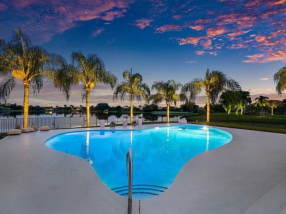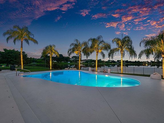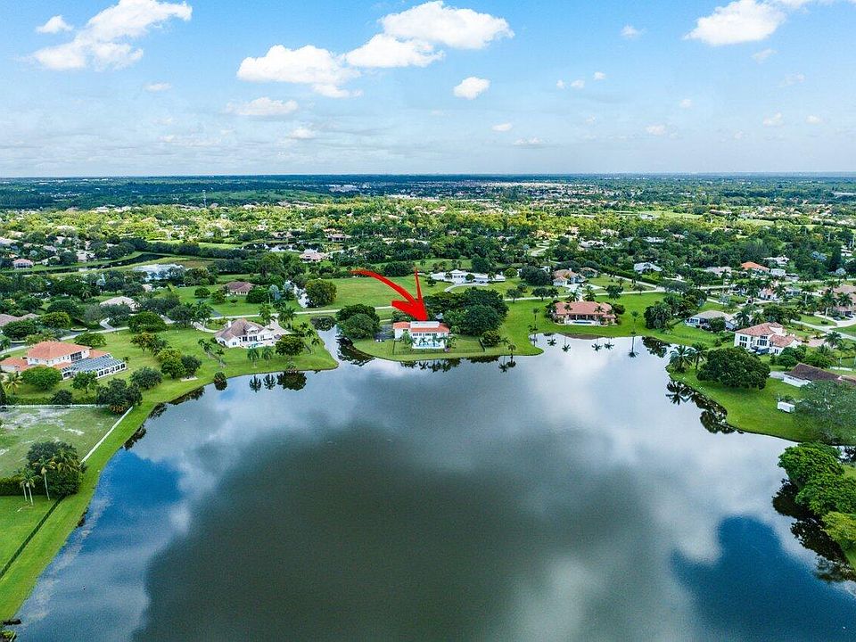 This is your chance to have one of the absolute BEST Waterfront lots in Palm Beach County! Drive by the spectacular Fountain to this 5 Bedroom to 2 story Estate home on 2.2 Acres (Over Twice the Size of Others) Surrounded by Water on 3.75 sides with a Heart Stopping, Jaw Dropping Long View of the 10 Acre Lake! As you enter the home, your eyes will be drawn to the oversized, stained wooden beams that oversee the Custom Brazilian Cherry and Iron Staircase which leads to the Upper Level Open Library! Magical Views from Every Window in the Kitchen / Bar Area overlooking the 25,000 Gal Pool & the Expansive Lake! Enjoy the Multi-Level Theater Room with 120'' screen! Impact Windows and Fenced in Yard! This is a ''MUST SEE!''