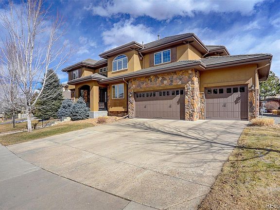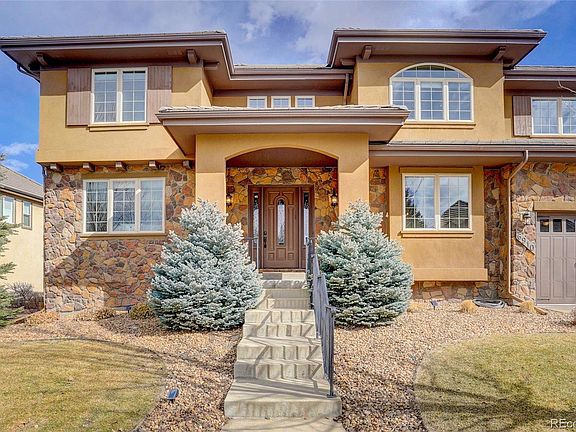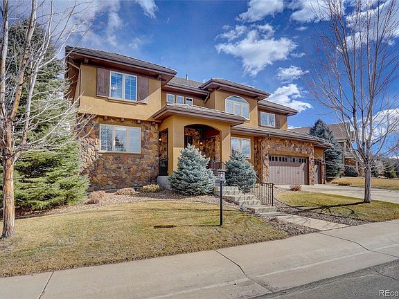 Don’t miss this stunning custom home located in the desirable Saddle Rock Golf Club neighborhood. This bright and spacious 4 bedroom, 3.5 bath home with main floor study is situated on a magnificent lot with views of the mountains and golf course. The curved staircase in the 2 story foyer makes a bold statement as you walk in the massive front door. The beautiful, refinished hardwoods invite you into the sprawling gathering room with towering ceilings and picture windows letting in an abundance of natural light. The chef’s kitchen is perfect for hosting with a large granite island and all the must haves. Ample custom cabinetry under mount and overhead lighting, large island with secondary prep sink, 6 burner commercial gas stove with hood, double oven, microwave, new refrigerator and dishwasher, and a huge walk-in pantry. The upstairs has a spacious primary bedroom with sitting area, vaulted ceilings, fireplace and mountain views. The luxurious, spa-like owner’s bath has an oversized, jetted soaking tub, separate walk-in shower, double vanity, and gorgeous heated stone floors. There are 3 additional bedrooms upstairs with a shared jack-n-jill bath, and a private en suite bath in bedroom #4. The basement is great for additional expanding with great natural light, egress windows, new large screen TV with surround sound and amp, workbench, overhead lighting and additional electric outlets, utility sink, hobby area and rough plumbed for a full bath. With almost 2000 sq ft this huge basement has room for everyone. Additional highlights include a whole home surge protector, 2 HVAC systems, Solar conduit line run to basement, oversized tall 3 car garage, 1 gigabit internet, 2 new water heaters, new carpet, new paint, new luxury light fixtures, new gas line hookup for BBQ, and humidifier. Just 2 blocks from the neighborhood pool, located in the sought after Cherry Creek School District, near E470, Southlands Mall, and Cherry Creek State park, this home will not disappoint!