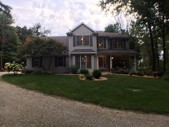 Well kept one of a kind farm house on 20 acres set back in a secluded wooded area. Location is ideal for privacy and solitude yet South Bend is a 15 minute drive away. Kitchen is updated with stainless steel appliances, butcher block countertops, and granite island with separate sink. Beautiful hickory hardwood floors laid with multiple width boards for a unique timeless design. Upstairs features a garden jet tub in the master and walk-in closets in every bedroom for plenty of storage. Yard highlights include an upper and lower wooden deck off the back of the house attached to large stamped concrete patio, a 32'x24' heated metal pole barn with concrete floor and 2nd well, 24' diameter above ground pool, scenic walking trails through the woods, and frequent deer visits to on site food plots. House comes with geothermal heat installed in 2015 and a 20KW whole house generator. Option to subdivide. Owner has additional farm equipment for sale as well if buyer is interested