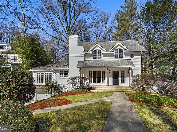 This house is a beauty, with loads of character both inside and out! While approaching the house, you’ll be captivated by the professionally landscaped front yard before entering onto a nice, long covered front porch. Upon entry a sizeable foyer greets all, uniquely equipped with a built-in display area. Crown moulding accents flow from the foyer into the living room. Warm up to the wood burning fireplace on cold winter nights, or to the morning sunlight streaming through the windows, which are nearly floor to ceiling height. The adjoining sunroom does not disappoint; it’s the perfect space for working or lounging. Its double doors open to one of three deck areas along the backside of the house. The eat-in kitchen area also opens to this wonderful deck area. This sizeable kitchen features granite countertops, and ample cabinet space with smart storage options. A bedroom and a fully tiled bathroom complete the main level. The upper level has two bedrooms with two en suite bathrooms. High ceilings grace the primary bedroom suite, which is flooded with natural light, has a huge walk-in closet, and has access to a second deck. Another large third deck is accessible from the walkout lower level. Access is off the good-sized recreation room, which has backyard views and recessed lighting. Two bedrooms, a full bathroom, and functional utility room with direct access to the garage complete this level. The whole house has been freshly painted, and has newly refinished hardwood floors and brand-new carpeting. There are dual HVAC systems and a whole house Generac generator. The nearly half-acre property extends into a lightly forested area providing some backyard privacy, and is really quite charming. You must see! Great location; easy access to DC and VA, I-495, downtown Bethesda, parks, golf courses, and much more!