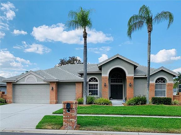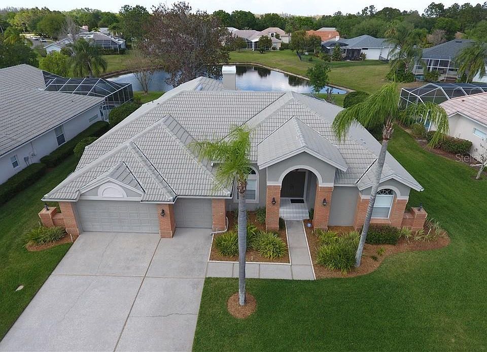 PRIDE OF OWNERSHIP & METICULOUS CARE ARE REFLECTED IN THIS STATELY WATER FRONT HOME! From the moment you enter the double doors into your welcoming foyer, you'll see the WATER VIEWS FROM ALMOST EVERY ROOM! Your den is placed perfectly with double glass doors for TONS OF NATURAL LIGHT yet privacy too! Formal Living & Dining room spaces lead you to the HEART OF THE HOME! Crisp white cabinetry, counters & appliances accented by flattering back splash with tons of task space, island/breakfast bar, eat-in space and built in desk too! This kitchen is perfect for gatherings & entertaining as it flows effortlessly into large family room & also spills over to the expansive screened lanai & pool area! Can you say, "FLORIDA LIFESTYLE"! Family room has gas fireplace, soaring ceilings and also enjoys all those water views! The triple split floor plan features 3 OVER SIZED GUEST ROOMS & 2 FULL GUEST BATHS. Perfect for kids, overnight guests or in laws that need a little extra privacy! On the other side of the home you'll find your master suite with large master bath offering dual sinks, garden tub & separate shower! CALIFORNIA CLOSETS TOO! Finally, outside you are treated to meticulously cared for landscape, 1/3 acre of lush & private tranquility, perfectly placed pool surrounded by generous pool decking to enhance your family's outdoor experience! STEINBRENNER SCHOOL DISTRICT, 20 minutes to the airport, 3 block high stem wall so seller pays no flood insurance and get's an even better view of your serene pond while enjoying all that this great community offers in its' perfect location!