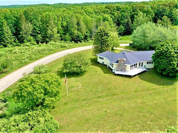 Peace and tranquility are at premium with this offering just north of Harbor Springs that is perched high on a bluff above the famed Tunnel of Trees. With south facing exposure natural light is plentiful and the oversize lot affords the privacy to enjoy it. There is a large deck that wraps around the massive stone chimney and looks over the large lawn with mature plantings that are easy to maintain, this a perfect for set up for; outdoor entertaining, children to recreate, or dogs to practice their retrieving skills. Inside you will find a unique open concept main living area with vaulted ceilings and huge fireplace that is the focal point of the room. There are two wings on each side of the home each containing a bedroom and a full bath, the basement covers the entire footprint of the house and has lots of possibilities, it even includes an extra wide staircase that goes up the over-sized garage. Maintenance has been meticulously monitored in the recent past with the addition of a new roof, new windows, A/C, Exterior paint, Generac system.... This is really a special home in a special location and at the right price to start enjoying Harbor Springs whether you want to be here year round, or use it as a resort getaway. Call Mac for a personal tour, it's easy to see.