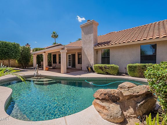 Perfect home in the desirable ARROWHEAD RANCH community. The private backyard is set up for peaceful relaxation with heated pool and covered patio. Vaulted ceilings in the living room and master bedroom give it a airy and open feel. The kitchen features upgraded GRANITE COUNTERTOPS and stainless steel appliances. Double sinks and 2 closets, one is a large WALK-IN CLOSET, in the master suite. The garage floor is finished with Epoxy and has TONS OF STORAGE. Newer carpet in living room and bedrooms. The fireplace, French patio door and window shutters add beautiful charm to this home.