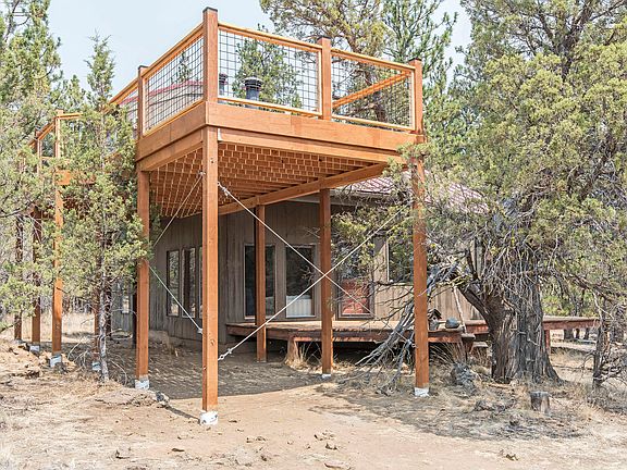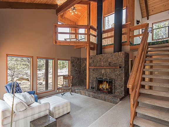 A captivating setting; Cascade Mountain views to the West and Painted Hills to the East. This cabin features a unique lava fireplace with double smokestacks and a 30' cathedral ceiling. The master bath has a jacuzzi tub and sauna, upstairs loft has a bedroom with a half bath. New large deck off the second story for outdoor entertaining. Large 40' X 40' shop for RV and 3 cars with a second floor, unfinished. Exceptional living only 1.5 miles from town, horses allowed.