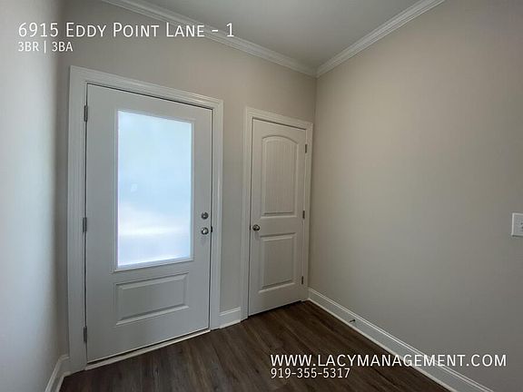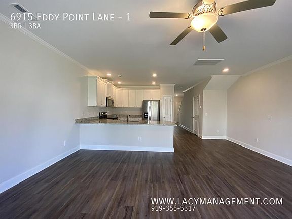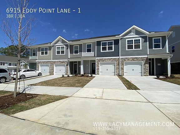 Stylish 3-Bedroom, 2.5-Bathroom Home in Prime Raleigh Location! Discover comfort, style, and convenience at 6915 Eddy Point Lane, a beautifully designed 3-bedroom, 2.5-bathroom townhome located in the sought-after Riverwalk Townhomes community in Raleigh. This home offers 1,639 square feet of thoughtfully crafted living space. The open-concept main floor welcomes you with a bright living area, a sleek kitchen featuring stainless steel appliances, granite countertops, and ample cabinet space, and a dining area ideal for both everyday meals and entertaining. The layout flows seamlessly for both comfort and functionality. Upstairs, you'll find three spacious bedrooms, including a luxurious primary suite complete with a private bathroom and a walk-in closet. Two additional bedrooms, a full hall bath, and a convenient half bath on the main level provide ample space for family and guests. Enjoy added convenience with a 1-car garage, perfect for parking or extra storage. Additional highlights include modern finishes throughout, in-unit laundry hookups, and dedicated driveway parking. Located in Wake County, Riverwalk Townhomes offers quick access to major highways, shopping centers, dining, and downtown Raleigh, all while providing a peaceful and well-maintained community environment. Don't miss your chance to make this stunning townhome your new homeschedule a tour today! Schedule an online showing at: Submit your application online at: Resident Benefits: **Get over $100 in monthly benefits for just $49.95 with our Resident Benefits Package! Enjoy valuable services with the flexibility to customize or opt-out Application Criteria: a) Gross household income of at least 3 times the rent b) A credit score of 650+ is preferred; we are happy to discuss your situation if your credit score is lower c) No evictions in the last 5 years d) A one-time pet fee of $300 per pet applies. An additional deposit may be required for multiple pets. No monthly pet fee e) One-time admin fee of $250 required to pay after signing the lease