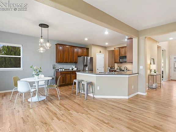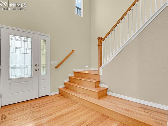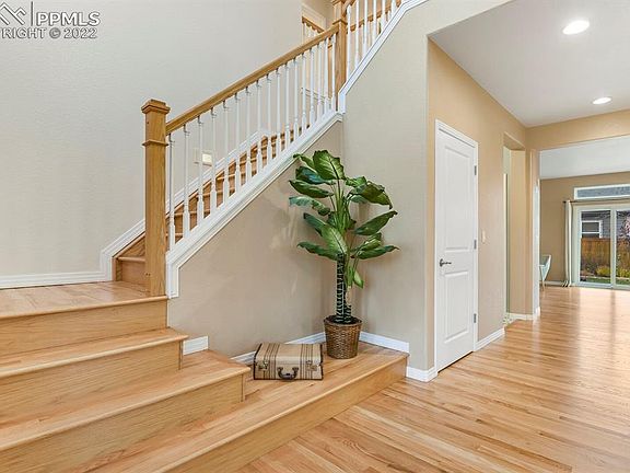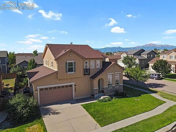 This well maintained, one owner home, built by John Laing Homes is situated on a corner lot with stunning Pikes Peak views & located in a desirable neighborhood. Beautiful flower gardens surround the backyard & enjoy sitting underneath the gazebo looking out at the lush lawn, flagstone patio/walk-ways & well manicured yard. When you enter from the covered front patio you are greeted with newly added stunning wood floors, wood staircase & vaulted ceilings. Home has an abundance of natural light & there is a formal dining room that could be used as an additional office space or library. Wood floors continue throughout the kitchen, eating nook & living room. Large gourmet kitchen with island counter -bar, stainless steel appliances, recessed lighting, pantry, butler station/coffee bar, tall cherry cabinets with crown molding & plenty of cabinet/counter-space. Eat-in nook has modern lighting & looks out to the backyard gardens & opens up to the living room. Oversized living room has a sliding glass door, large windows & gas fireplace with mantel. Main level office would also make a nice kids play area or entertainment room. Mud-room has modern flooring, custom cabinetry with butcher block-top, crown molding, & leads to garage. Fully finished garage has a taller garage door, workbench & service door to the exterior. Primary bedroom has a sitting area, views of Pikes Peak, adjoining 5 piece bathroom, & a cedar lined walk-in closet with custom shelves/built-in cabinets. Primary bath has modern lighting, stand-alone shower, soaking tub & double vanity. Laundry rm is conveniently located in the upper level as well as 2 additional bedrooms & full bath. Spacious unfinished basement is a clean slate, fully insulated, with high ceilings, room for more bedrooms & roughed in for a future bathroom. Updated furnaces, A/C units, 9ft ceilings, low maintenance stucco & custom stone. Too many upgrades to list! Walking distance to Ridgeview Elementary/park, shops, restaurants, & trails.