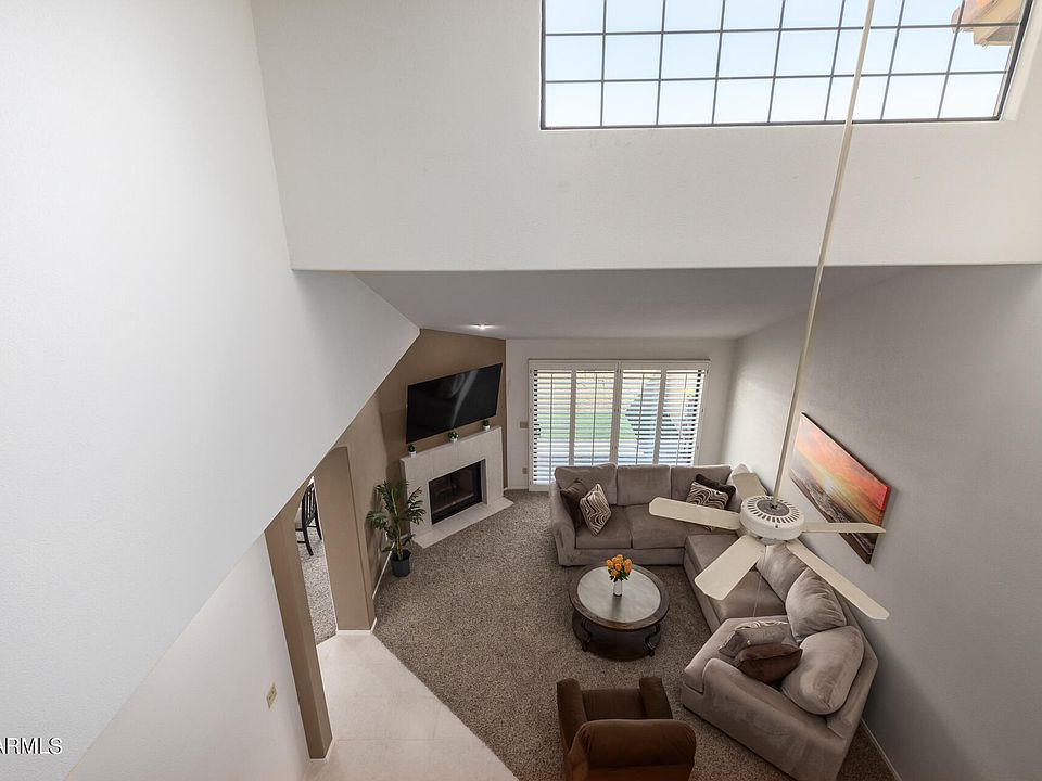 Welcome to your gated townhome in CameView Greens. The interior impresses you with dramatic vaulted ceilings, plantation shutters, a designer's palette, tile floors, soft carpet in all the right places, & an inviting living room with a warm fireplace. The eat-in kitchen provides built-in appliances, white cabinetry, enough counter space for meal preparations, a breakfast bar, & a breakfast nook with a bay window. Upstairs you find a primary retreat featuring a full bathroom with dual sinks & a shower/tub combo. The secondary bedroom is sizable, offering two closets & a sitting area. Sliding glass doors open to a private patio with turf lawn and pavers.Right outside your home there are 2 refreshing community pools as well as Silverado Golf Course and all that Scottsdale has to offer! Recent updates: New stainless steel electric range, new garbage disposal, updated kitchen cabinets, new hardware on all cabinets and drawers throughout home, new sink faucets in all upstairs bathrooms, eight windows and two outdoor patio doors replaced, solar powered/remote controlled black-out shade installed on large window above living room, new roof installed per HOA (2022), new patio pavers with turf (2022), new soft water system installed throughout home (2022), new hot water heater (2022), newer washing machine (2021), and newer stainless steel refrigerator (2020).