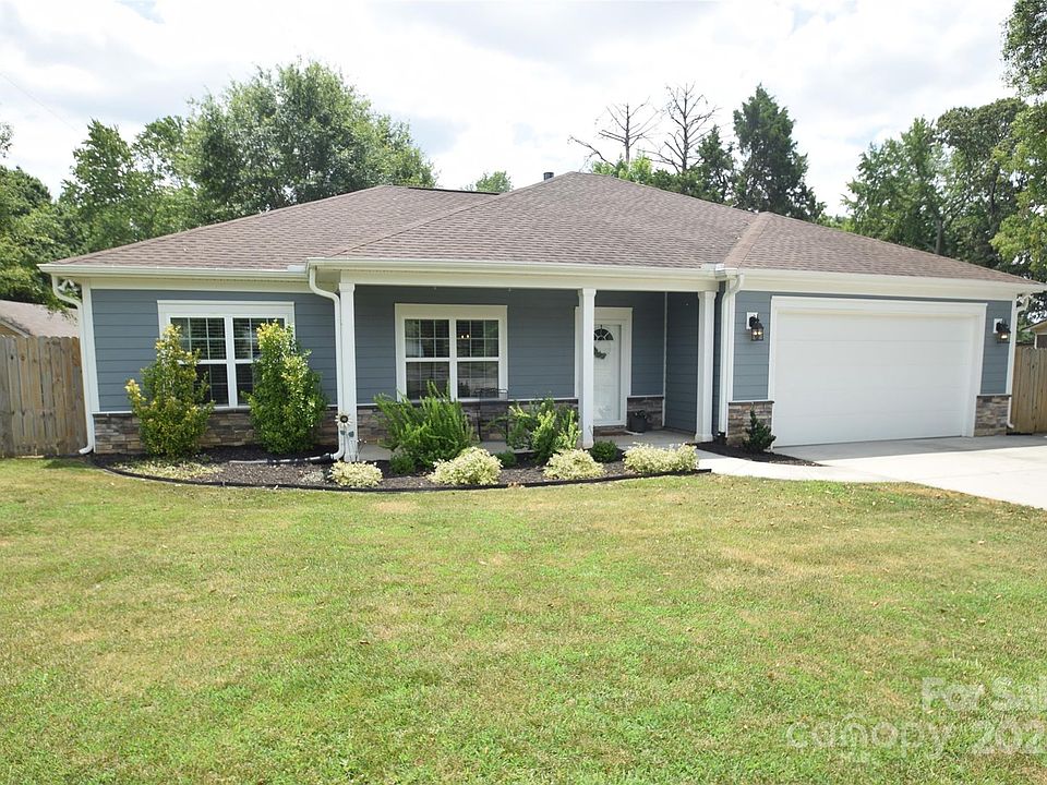 Charming Craftsman-style ranch, well maintained and upgraded over the past 5 years. This home welcomes you with an inviting living area featuring hardwood floors, a coffered ceiling, and a cozy fireplace. Enjoy the open layout and a kitchen that boasts granite countertops, a modern backsplash, a gas stove and dining area. The spacious primary bedroom offers a tray ceiling, double vanity, shower, garden tub and walk-in closet with organizers.