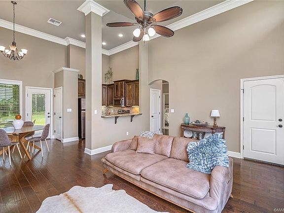 This beautiful home in North Shreveport's New Territory community boasts the ideal open concept layout, soaring 12 foot ceiling and stunning curb appeal with lush landscaping. Step inside to gorgeous hardwood flooring, some fresh paint, crown molding throughout, and a cozy kitchen with granite countertops and stainless steel appliances. The spacious master suite features a dual sink vanity, separate stall shower and bathtub, and a walk-in closet. Relax in the backyard with an extended covered patio and enjoy the privacy with the woods behind. The driveway has been extended for additional parking. You will love this quiet location while still being a short drive to downtown Shreveport, I-49 and Youree Drive.
