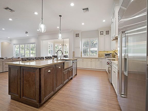 The kitchen is a chef's delight, spacious with Wolf appliances and a subzero refrigerator. The huge island is great for preparing and serving food. The butler's pantry offers custom built-in shelving and has tons of room. Stone accents, pendant lighting and a stove hood are just some of the contemporary and stylish features that add to its wow factor.