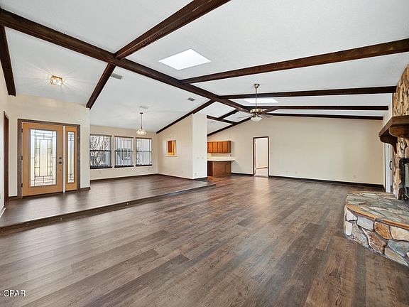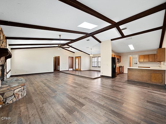 Tucked away on over 2.5 acres, this 3-bedroom, 2.5-bathroom home offers a rare blend of space, tranquility, and potential. Enjoy a peaceful retreat just minutes from town, featuring a solid foundation and plenty of room for customization. The freshly painted stucco and stone exterior (2022) enhances the home's curb appeal, while inside, a thoughtful split-bedroom layout offers both privacy and functionality. The bright, welcoming kitchen includes a breakfast bar and all appliances. In the spacious family room, a stone fireplace, skylights, and charming beamed ceiling create a warm, inviting atmosphere. A versatile bonus room offers endless possibilities—perfect as a home office, playroom, fitness studio, craft space, or cozy media lounge tailored to your lifestyle. The primary suite features sliding doors to the covered patio, a walk-in closet, and an ensuite with double vanities, a separate shower, and a Jacuzzi tub ready for replacement—an ideal opportunity to create your own spa-like retreat. The guest bath includes a 20-gallon water heater, while the primary bath is supported by a 50-gallon heater, ensuring ample hot water throughout. Many of the home's original features remain, including a well-functioning HVAC system that may warrant future updates for enhanced efficiency. The roof was replaced in 2019 for added peace of mind, and the septic system was pumped last month, keeping everything in excellent condition. Step outside to a covered patio with a wood-accented ceiling—perfect for relaxing, dining, or entertaining. The generous lot provides plenty of space for pets, gardening, or play, while the shed and pole barn offer valuable additional storage. A well house with a private well and an irrigation system around the home makes it easy to maintain the surrounding lawn and greenery. This property truly offers the best of both worlds—quiet country living with convenient access to shopping, dining, schools, and the beautiful beaches of Panama City Beach. With its spacious lot and room for updates, this home is a wonderful canvas for creating your perfect country retreat.