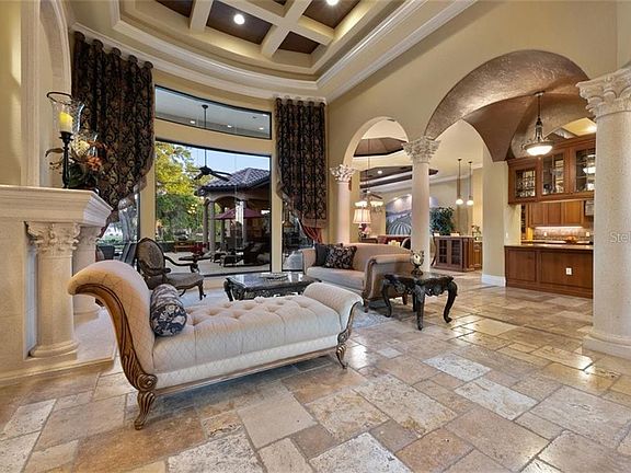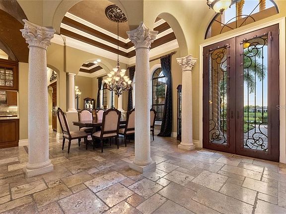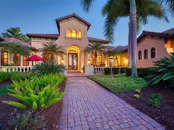With breathtaking views of the stunning lake and lush tropical landscaping, this exquisite residence situated in the Country Club of Lakewood Ranch is a perfect place to call home. At first glance, one cannot help but notice the many architectural details including an entry stone fountain, intricate crown moldings, high ceilings, travertine flooring throughout the main living areas, numerous ceiling treatments and hand-painted murals. The elegant living room offers a beautiful stone fireplace and views of the pool and lake through the large panoramic window. The gourmet kitchen leaves no detail missed with solid wood cabinetry, copper sinks, 48" six-burner DCS gas stove with grill, built-in Miele coffee system, large hidden walk-in pantry, Sub-Zero dual temperature wine storage, and a butler's pass-through to the spacious dining room. Adjacent to the kitchen is a breakfast nook with lake views through the aquarium window along with a family room with pocket sliding glass doors leading to many of the entertaining areas on the lanai. Enter into the bonus/game room featuring a built-in bar and private door to another seating area. The master retreat features large walk-in closets, private access to the lanai and a luxurious master bath with dual sinks, soaking tub and walk-in shower. Other notable features include a study/den with a built-in wood desk, three guest suites, two with en-suite baths, grand lanai with a heated saltwater pool, spa, outdoor kitchen and a fireplace, fenced-in yard and an oversized three-car garage. With a place where luxury is the backdrop for an extraordinary way of life, this enchanting residence is one that truly stands out from the rest.