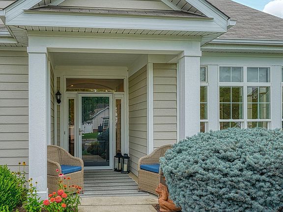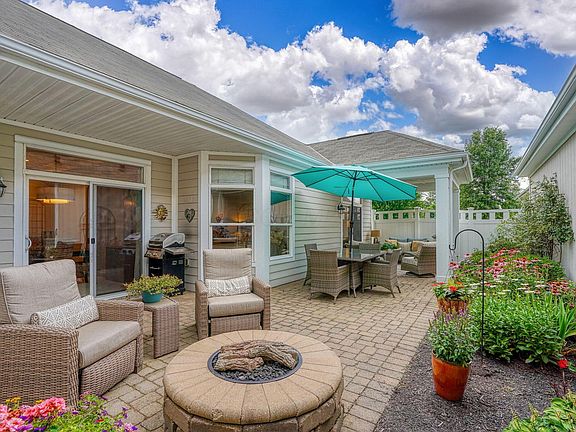 Welcome home to this well appointed free-standing condo in desirable Woods at Sugar Run Condominium. Epcon Palazzo ranch & former model home with extra builder features throughout. This home offers an open floor plan with tray ceilings, transom windows, upgraded trim package & engineered hardwood flooring in main living areas. The living room features a gas fireplace with wood mantel and a full view storm door at the foyer. The four seasons room is perfect for a home office and is great flex space. The kitchen offers upgraded staggered cabinetry, Quartz counter tops, SS GE appliances, tile back splash, a large center island with pendant lighting and a matching desk/work station. The dining room features a beautiful light fixture and patio doors that lead to the private, fenced & gated courtyard. The primary bedroom suite has tray ceilings, lighted ceiling fan & patio doors leading to a covered rear porch. New carpeting in both bedrooms, custom lighting and roller shades throughout the home. Both bathrooms offer tile flooring, raised vanities and elongated toilets. The laundry room offers built in cabinetry, laundry sink & the washer and dryer convey. Enjoy outdoor living on the private courtyard with stone pavers, water feature, fire pit, trellis's and beautiful landscaping. The 2.5 car attached garage is oversized and offers plenty of storage with shelving and ladder to attic. The community clubhouse is just steps away and offers a fitness room, a gathering space for residents and family parties and a swimming pool. Enjoy expansive ponds and walking paths in this beautiful community. Schedule your private showing on this beautiful home today!