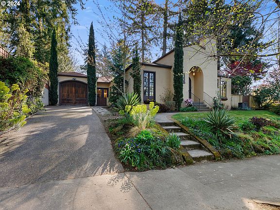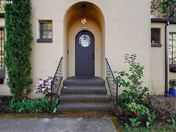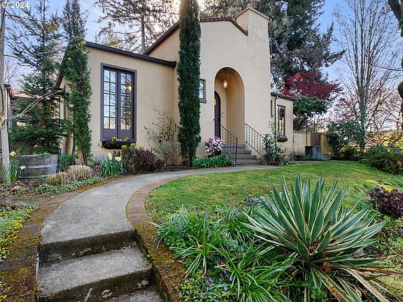 Step into this tastefully updated 1927 Eastmoreland Mediterranean home and immerse yourself in its elegant period charm, showcasing curved archways and original hardwood flooring. The open floor plan creates an ideal space for entertaining, complemented by a new stucco fireplace surround that emanates a cozy chic atmosphere. French doors lead to the enchanting backyard, featuring three distinct entertaining areas and low-maintenance green space. The fully updated chef's kitchen is a highlight, boasting a custom built-in island, Solatube skylight, new marble backsplash, refinished countertops, a gas range, and stainless steel appliances. The excellent floor plan optimizes space with three bedrooms on the main level and a family room, an additional bedroom, and office space downstairs. The sprawling main-level primary suite encompasses an updated bathroom, two walk-in closets, and a private patio plumbed for a hot tub for a luxurious retreat. Additional updates include a new water heater, smart thermostat & doorbell, fresh interior paint, light fixtures, and faucets. The home also provides incredible storage with multiple closets, an attached garage, and a separate laundry room. Adjacent to the amenities of beautiful Berkeley Park with access to highly-rated schools, this property offers a prime opportunity to live in one of the city's most premier neighborhoods. [Home Energy Score = 2. HES Report at https://rpt.greenbuildingregistry.com/hes/OR10188956]