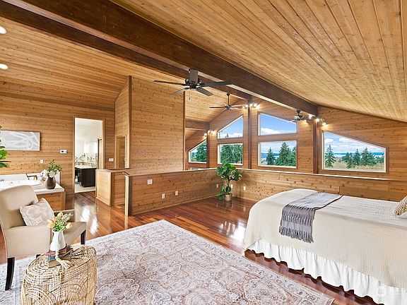 This elegant rustic home seamlessly blends with the natural surroundings, nestled on shy 5 lush acres with breathtaking views of Mt. Baker, Puget Sound & city skyline. With 3 bedrooms & 3 baths spread across 2960 sq. ft, there's ample space for relaxed entertainment accentuated by vaulted wood ceilings & natural light. Wake up to the magical view from the loft primary ensuite featuring spa bath and cedar walk-in closet. Flex space in the basement has ample room for creative pursuits, car storage or finish as desired. Located close to a golf course, marina & beautiful trails in Maury Marine Park, this home offers the perfect blend of tranquility and convenience. Embrace the opportunity to make this unique property your own private retreat.