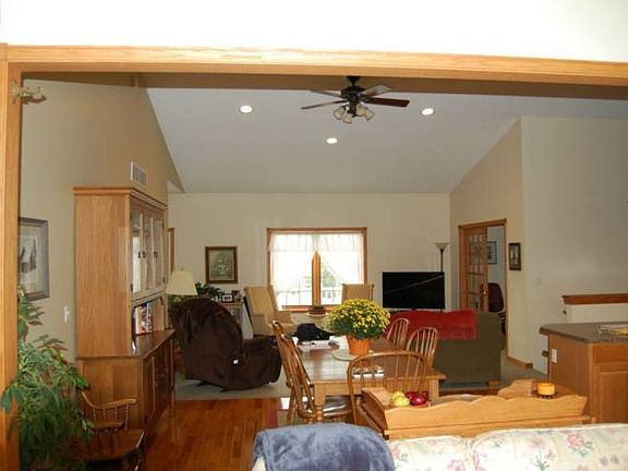 A must see! 2006 ranch on almost 10 acres and a beautiful view! Deer hunting, too many fruit trees to mention, rolling hills, and some woods. Open floor plan, family room, central air. Full partially finished walk-out basement with in floor heat. 28x30 pole barn, two car attached garage and home is wired for generator. Triple payne pella windows, master bath with walk-in closet. Solid oak doors throughout and vaulted ceilings, you must see to appreciate this one of a kind!