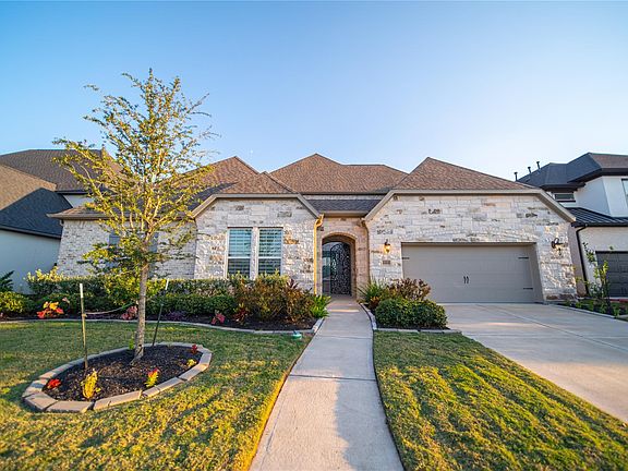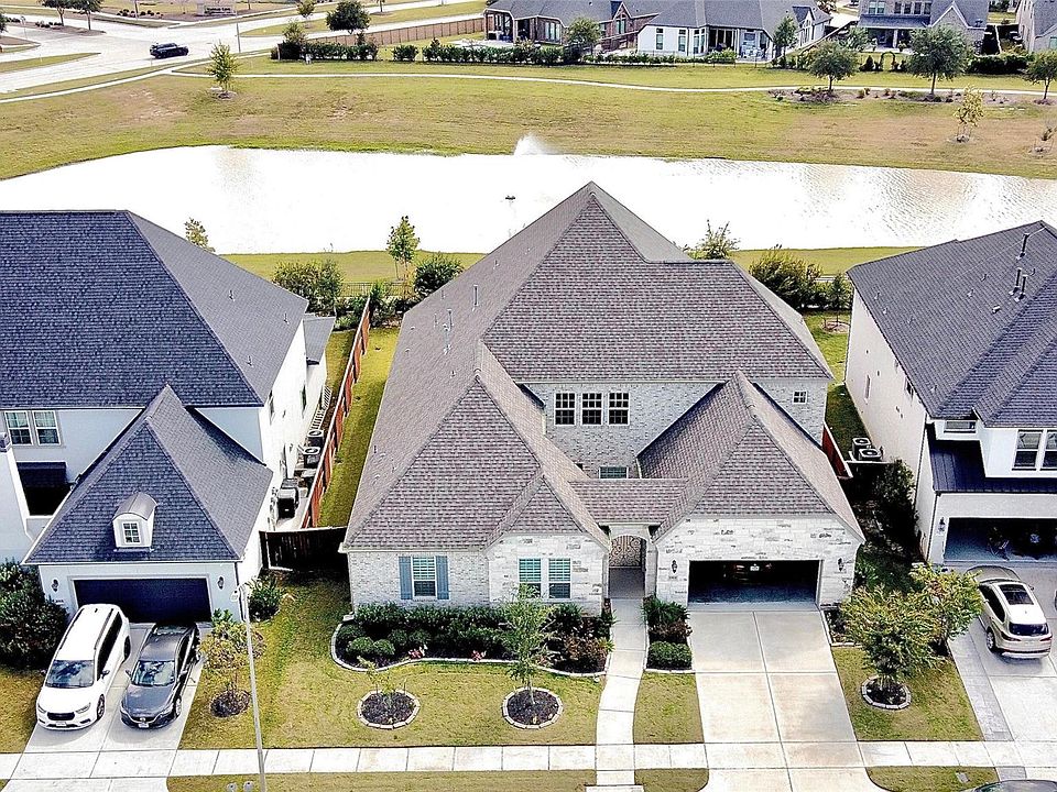 Nestled on a premium lot with no back neighbors and peaceful lake views, this exceptional 1.5-story residence blends luxury, privacy, and thoughtful design throughout. The home offers 4 bedrooms downstairs with an optional 5th bedroom upstairs, 4.5 baths, a 3-car tandem garage, private home office, and an upstairs game room and media room with wet bar. A welcoming courtyard leads to an open-concept floor plan filled with natural light and stunning water views. The great room features a vaulted, beam-accented ceiling, cozy fireplace, and sliding glass doors opening to a spacious covered patio for seamless indoor-outdoor living. The chef's kitchen impresses with double ovens, 5-burner gas cooktop, an 11-foot island, and extended cabinetry that flows into the breakfast area. The primary suite offers a bay window overlooking the lake, spa-inspired bath with freestanding tub, rainfall shower, and an oversized walk-in closet.
