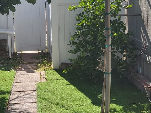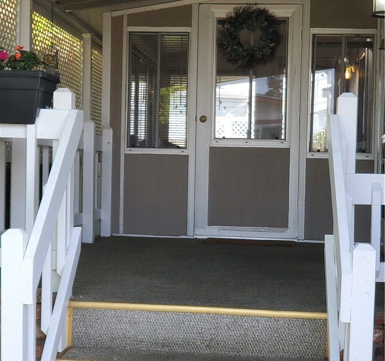 Upgraded and move-in perfect. Newly painted interior with upgraded dual pane windows. Light colored laminate floors for easy cleaning. The ensuite master bathroom had been remodeled with a new cabinet, spa tub, and walk in shower done in stone and new glass doors. There is a large sunroom attached to the 2nd bedroom with entrances to the front deck and back patio/yard. A large covered patio allows for outside dining and a great place to relax. New astro turf is great for the animals along with the dog door to the outside. Many fruit trees adorn the property with an additional shed for outside use. Vinyl fencing has been added to fully enclose the yard and allow for privacy. This is a great property in a desirable location toward the back of the community on a corner property with limited traffic. Lots of trees add shade and privacy with plumeria trees to add tropical smells. This great 55+ community has a community center with pool, club house, billiards, and lots of fun activities.